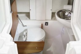 Koupelna s WC v konroli: elektrické WC, nádrž na odpadní vodu 40 litrů, nerezová madla, teaková skříň
